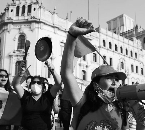 Un gesto elevado rompe el silencio de la ciudad. Entre banderas, máscaras y cansancio, la multitud se convierte en una sola voz que reclama ser escuchada. La imagen captura un instante donde la convicción pesa más que el miedo.
