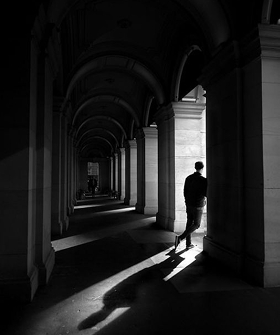 La figura solitaria avanza entre arcos que proyectan sombras largas. La luz recortada en el suelo acompaña su paso, como si el espacio marcara un rumbo silencioso en medio de la ciudad.