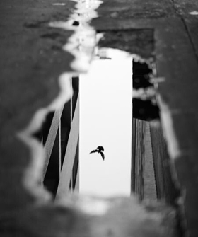 Un reflejo accidental revela un instante suspendido: entre muros verticales y agua quieta, un ave atraviesa el encuadre. La escena convierte lo cotidiano en un fragmento inesperado de movimiento y libertad.