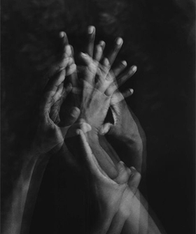 Manos superpuestas en un movimiento borroso crean una imagen entre agitación y búsqueda. La repetición del gesto sugiere un estado emocional intenso, casi como si la fotografía capturara una inquietud interna.