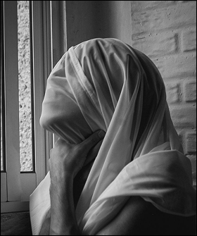 Una figura cubierta por una tela se vuelve anónima y vulnerable. La luz que entra por la ventana revela pliegues y formas que hablan de encierro, introspección y el deseo de ocultarse del mundo.